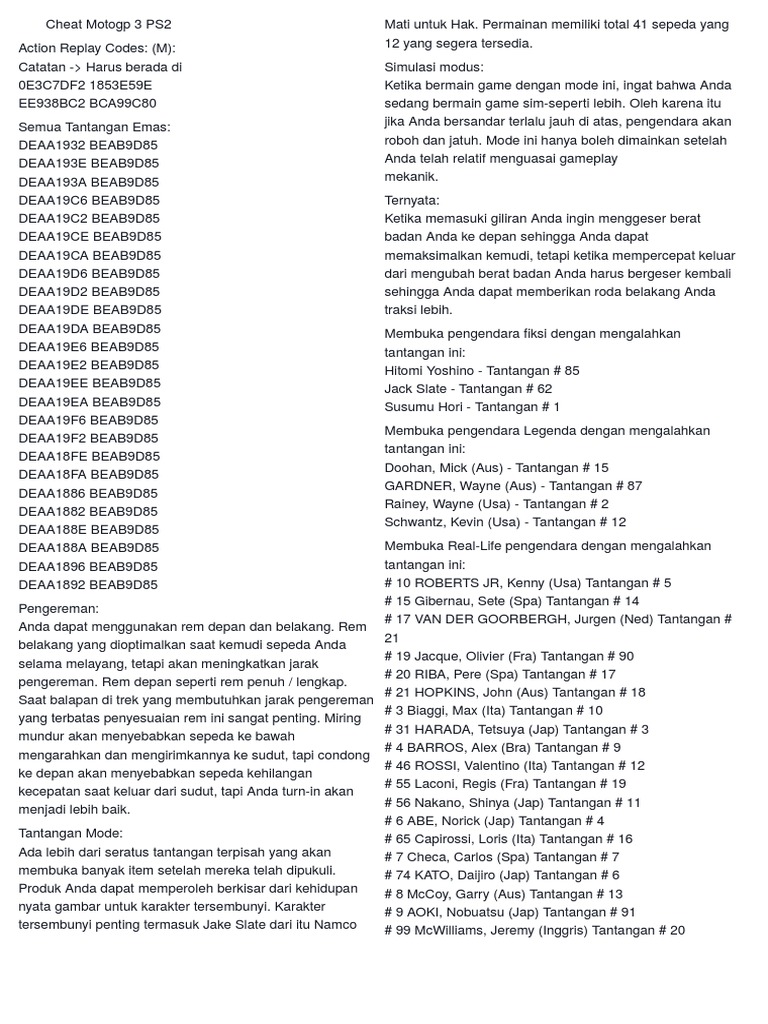 Use the above links or scroll down see all to the playstation 2 cheats we have available for moto gp 3. The best place to get cheats codes cheat codes walkthrough guide faq unlockables tricks and secrets for playstation 2 ps2. Cheat mtx mototrax ps2 bahasa indonesia membuka semuanya.